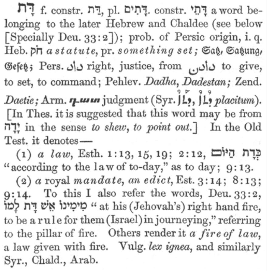 Commentators have long been puzzled by אֵשְׁדָּת eshdat which appears to be a combination of the Hebrew word “fire” and the Aramaic word “decree”. This, along with the place name Dothan, would be the only instances of Persian loanwords (via Aramaic) in the Hebrew Bible. Such instances (as well as other textual evidence) lead most contemporary scholars to date the Pentateuch either in the Persian period (6th to 4th century BCE) or the Hellenistic period (3rd to 2nd century BCE).